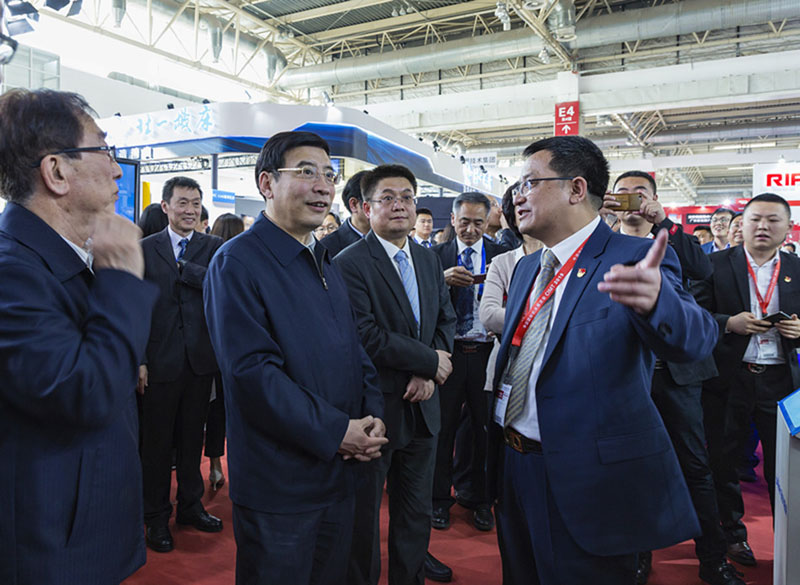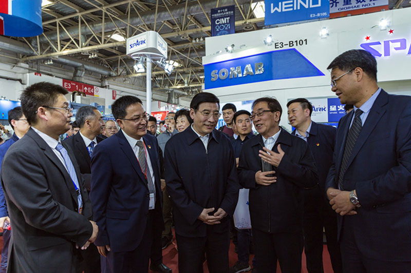 當(dāng)天下午,工業(yè)和信息化部部長苗圩等領(lǐng)導(dǎo)蒞臨星火機(jī)床公司展臺參觀指導(dǎo)。集團(tuán)公司黨委書記、董事長蔣保權(quán)向苗圩部長介紹了企業(yè)生產(chǎn)經(jīng)營和展品研發(fā)制造情況,并進(jìn)行了親切交流。苗圩對星火機(jī)床公司研發(fā)的MK84160x70x63大型全自動數(shù)控軋輥磨床等展品給予充分肯定,并希望企業(yè)以創(chuàng)新促發(fā)展,以質(zhì)量促發(fā)展,加大轉(zhuǎn)型力度,走質(zhì)量效益型之路,為振興中國裝備制造業(yè)作出新貢獻(xiàn)。星火機(jī)床集團(tuán)公司總經(jīng)理劉勝,黨委副書記、副總經(jīng)理蔣俊,總經(jīng)理助理劉強(qiáng)及銷售、技術(shù)、管理等有關(guān)人員熱情接待。