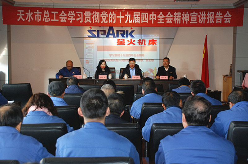 1月7日,天水市總工會學(xué)習(xí)貫徹黨的十九屆四中全會精神宣講報告會在星火機床公司舉行,天水市總工會邀請中共天水市委宣講團成員、甘肅林業(yè)職業(yè)技術(shù)學(xué)院教授謝小平為星火機床公司黨支部書記、分會主席和部分員工作了《以制度優(yōu)勢托起人民獲得感、幸福感、安全感》為主題的黨的十九屆四中全會精神學(xué)習(xí)專題宣講報告。天水市總工會黨組成員、副主席張虎琴,副主席衡俊強,星火機床公司黨委副書記、工會主席蔣俊及各黨支部書記、分會主席和部分員工80多人參加了報告會。衡俊強主持報告會。