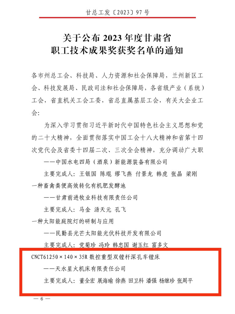 日前,省總工會、省科學技術廳、省人力資源和社會保障廳聯(lián)合公布了第十六屆(2023年)甘肅省職工優(yōu)秀技術創(chuàng)新成果獲獎名單,星火機床公司董全宏、展海瑜等人完成的CNCT61250×140×35R 數(shù)控重型雙鏜桿深孔車鏜床榜上有名,榮獲二等獎。