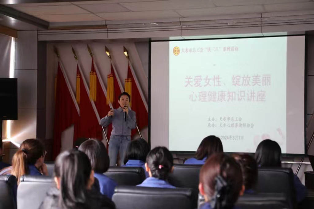 從“心”出發(fā),綻放芳華。在“關(guān)愛女性,綻放美麗”心理健康知識(shí)講座中,國(guó)家一級(jí)健康管理師、國(guó)家二級(jí)心理咨詢師、天水心理咨詢師協(xié)會(huì)秘書長(zhǎng)、高級(jí)家庭教育指導(dǎo)師胡建梅運(yùn)用生動(dòng)鮮活的案例,以現(xiàn)場(chǎng)互動(dòng)的方式,深入淺出地介紹了豐富的女職工心理健康專業(yè)理論知識(shí)。她從什么是情緒管理、如何正視自己、相信自己、熱愛自己等幾個(gè)方面,解析了心理健康的基本知識(shí),引導(dǎo)大家保持良好的心理狀態(tài),正確認(rèn)識(shí)挫折與困難,學(xué)會(huì)自我調(diào)節(jié)和管控情緒,化解平衡工作與生活的壓力,提高生活質(zhì)量和幸福感。