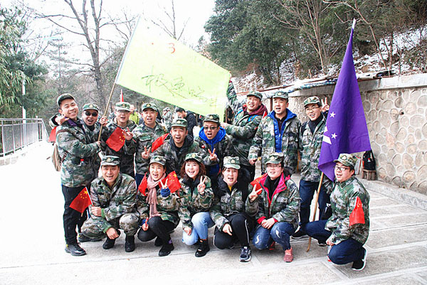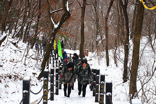 沿山繞行的臺(tái)階上覆蓋了一層薄冰和浮雪,讓大家不得不小心謹(jǐn)慎,聽(tīng)著腳下咯吱咯吱的聲響,看著一直延伸目所不及的臺(tái)階,大家雖然疲倦之極,但他們都知道這是一次意志、毅力、體能的極限考驗(yàn),雖然有的同志體力不支,依然互相鼓勵(lì)、相互攙扶,一步一步向山頂行進(jìn)。