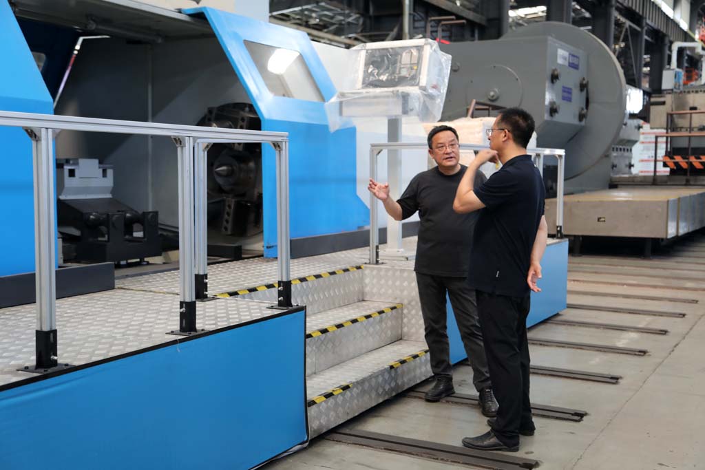 劉建一行在蔣保權(quán)陪同下參觀了工業(yè)園加工車間和各類產(chǎn)品裝配現(xiàn)場,向調(diào)研組重點介紹了生產(chǎn)裝配中的數(shù)控重型臥式車床、車輪車床以及五軸聯(lián)動機床等典型設(shè)備,并簡單回顧了企業(yè)的發(fā)展歷程和歷史沿革。
