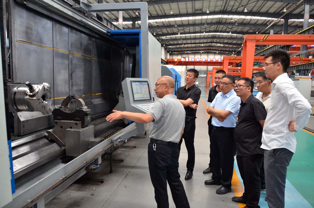 蔣俊陪同客人參觀了工業(yè)園主要生產(chǎn)現(xiàn)場,介紹了星火公司和青重公司研發(fā)生產(chǎn)的大型五軸車銑復(fù)合加工中心、車輪車床等各類產(chǎn)品的性能特點、技術(shù)水平和市場應(yīng)用情況。