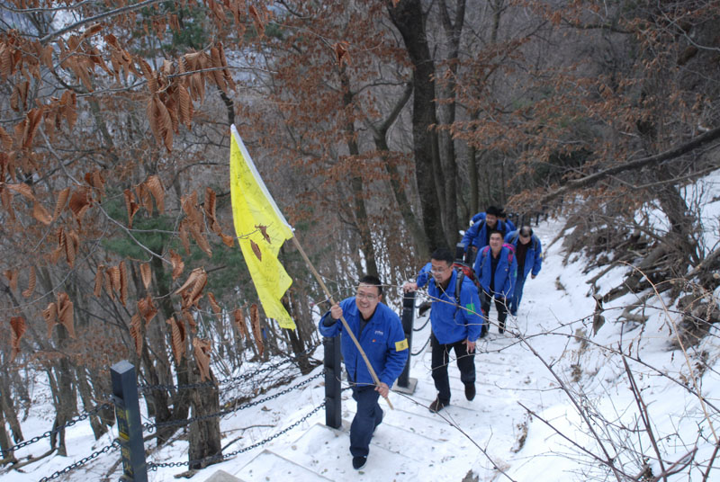 一切安排就緒,隊員們朝著山頂出發(fā)。山里的天氣較之外面更為寒冷,爬山的過程中還不時有雪花飄落,上山的臺階上堆積了一層薄冰,增加了爬山的難度。盡管如此,大家爭先恐后,竭盡全力,直奔目標(biāo)。熱情的回聲打破了山谷的寂靜,冰冷的空氣仿佛也有了熱度。10公里的上坡及上山,對平時鍛煉不足的人來說確實(shí)是極大的考驗(yàn),爬山過程中,大家相互鼓勵、互相扶持,幾位年紀(jì)偏大或身體不適的隊員克服了困難,堅持爬到山頂,決不放棄。