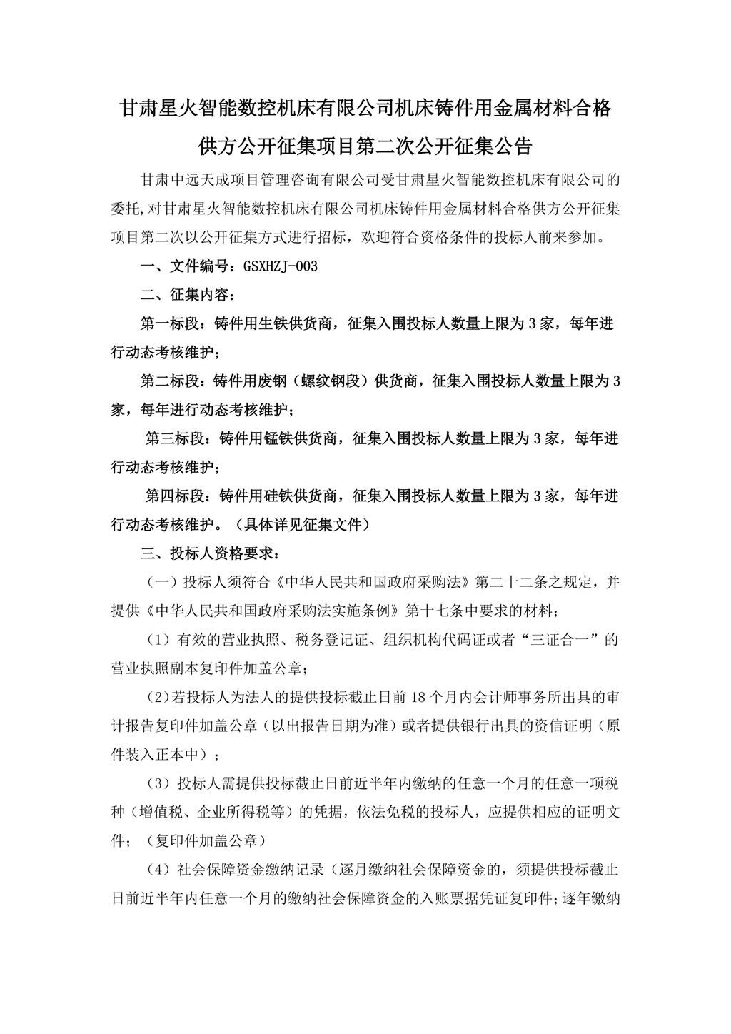甘肅星火智能數(shù)控機(jī)床有限公司機(jī)床鑄件用金屬材料合格供方公開征集項(xiàng)目第二次公開征集公告